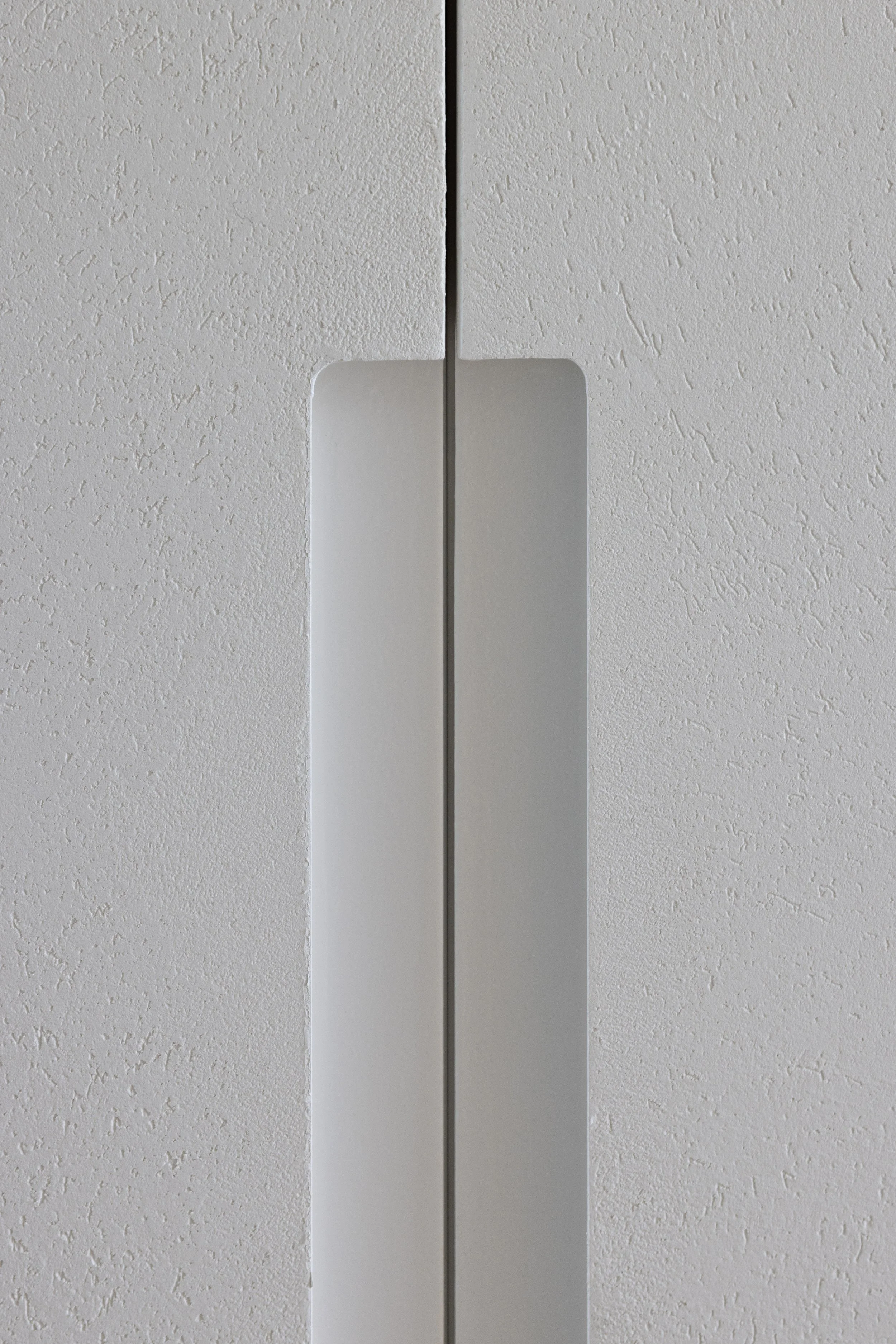 Dit blok ordent de volledige ruimte zonder ze te verdelen - het creëert zichtlijnen en doorgangen die de blik steeds naar het zeezicht leiden. De bekleding in zeer fijne schildertechniek contrasteert met de strakke lijnen en geeft het geheel een zachtheid van op afstand maar diepte en textuur van dichtbij.