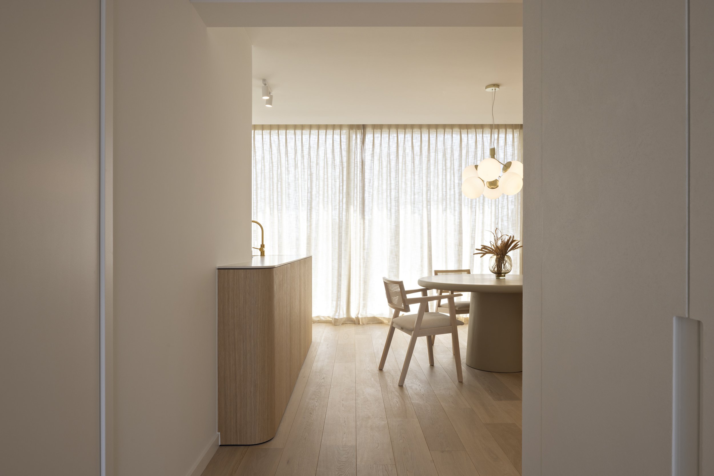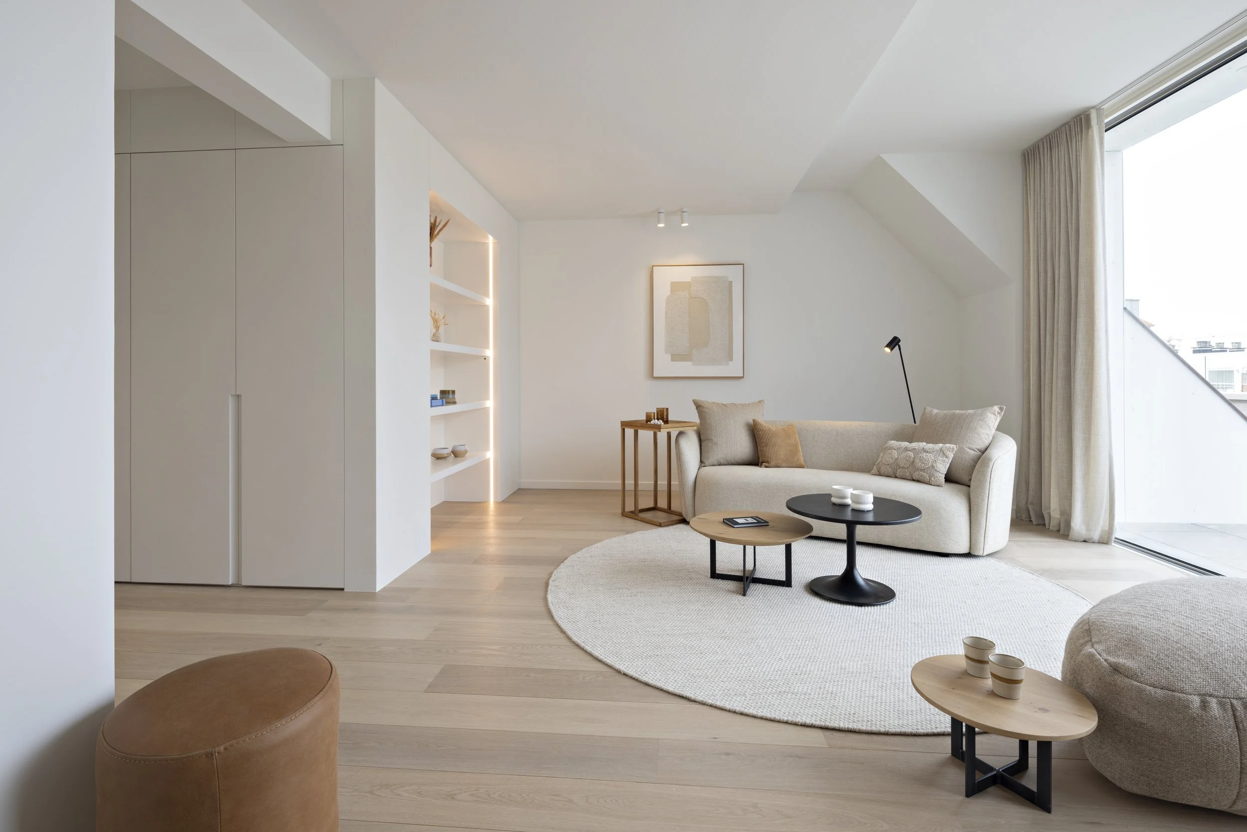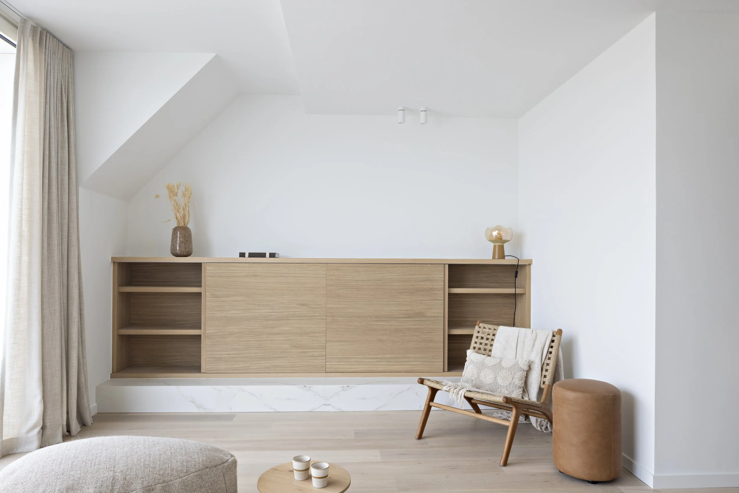 Op de bovenste verdiepingen van een markant gebouw in het hart van Knokke - met een onbelemmerd panorama over het plein richting zee - herontdekten we dit duplex penthouse als een oefening in gelaagde eenvoud. De opdracht was helder: een volledige herindeling die het buitengewone uitzicht centraal stelt, zonder de intimiteit van een thuis te verliezen. Het resultaat balanceert tussen bohemian warmte en minimalistische rust, waar elk materiaal zijn eigen verhaal vertelt.